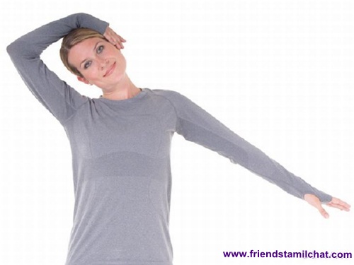 This stretch works on lengthening and soothing both sides of your neck. It also stretches the upper shoulders, chest and the mid-upper back.