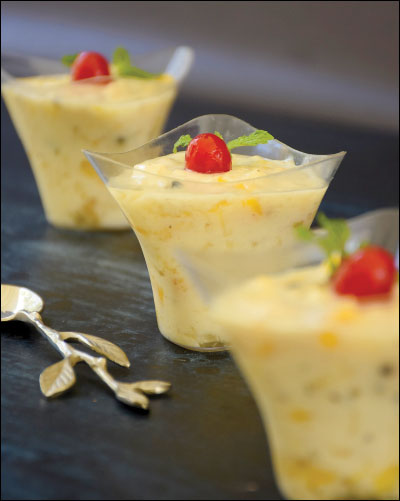 தயிரைத் துணியில் போட்டு மூட்டை போல கட்டி மூன்று மணி நேரம் தொங்கவிடவும். பிறகு, தண்ணீர் வற்றிய தயிரை நன்றாக அடிக்கவும். சோள மாவுடன் சிறிதளவு தண்ணீர்விட்டுக் கரைக்கவும், பாலைப் பாத்திரத்தில் ஊற்றிக் கொதிக்கவிடவும். பால் நன்கு கொதிக்கும்போது சோள மாவு கரைசலைப் பாலில் சிறிது சிறிதாக ஊற்றிக் கிளறவும். நன்கு கெட்டியான பின் இறக்கி ஆறவிடவும். இதனுடன் உப்பு, மிளகு, சீரகத்தூள், சாட் மசாலாத்தூள் சேர்த்துக் கலக்கவும். மற்றொரு பாத்திரத்தில் பழத்துண்டுகள், கறுப்பு உப்பு, சர்க்கரை, எலுமிச்சைச் சாறு சேர்த்துக் கலக்கவும். இந்தப் பழக்கலவையுடன் பால் கலவை, தயிர் சேர்த்துக் கலக்கவும். இதை ஃப்ரிட்ஜில் வைத்து எடுத்து. கொத்தமல்லித்தழை, புதினா இலைகள், செர்ரி சேர்த்து அலங்கரித்து, ஜில்லென்று பரிமாறவும்.