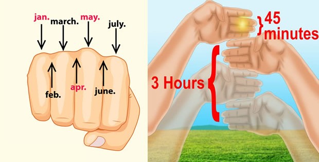 With the closed fist counts the months by the knuckles. Each knuckle and each cleft between them represents a month. If the month falls on knuckle has 31 days, if it falls into a cleft has 30 or less.