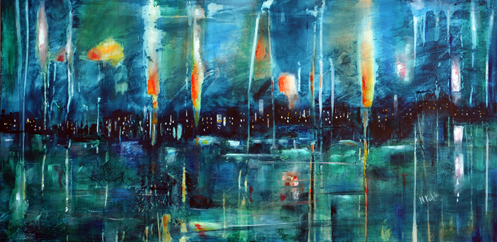 Although the spectacular use of colors, contrasts and shadows, the playful use of diagonals creating a solid sense of perspective and the multiple levels of volume and texture continue to create her unique works, she lately altered her style: In fact she started creating semi-abstract paintings in which the theme is recognizable as a whole even if one cannot identify distinctive details.