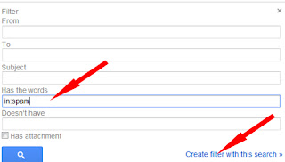 http://1.bp.blogspot.com/-kNsBHXCPw9E/UEB_4EYOBEI/AAAAAAAAHEM/ezYTu9CajQI/s320/reate-filter-for-spam-mail-step-2.jpgஅதற்கு அடுத்து தோன்றும் ப்ல்டர் Filter என்னும் பெட்டியில் has the words என்பதற்கு கீழாக in:Spam என தட்டச்சிடுங்கள். பிறகு கீழிருக்கும் create filter with this search என்ற வசதியைத் தேர்ந்தெடுத்து கிளிக் செய்யுங்கள்.