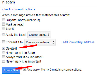 இப்போது தோன்றும் பெட்டியில் in:spam என்ற விண்டோவில் delete it என்ற check box -ல் டிக் செய்துகொள்ளுங்கள். கூடவே also apply filter to என்பதையும் தேர்வு செய்துகொண்டு கிரியேட் ப்ல்டர் என்ற பட்டனை தேர்ந்தெடுத்து கிளிக் செய்யவும்.