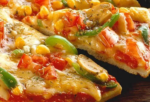 Choose vegetable toppings for pizza instead of meat and you may be able to shave 100 calories from your meal. Other skinny pizza tricks: Go light on the cheese or use reduced-fat cheese and choose a thin, bread-like crust made with just a touch of olive oil.