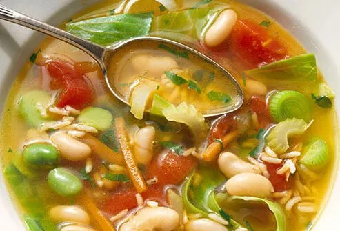 Add a broth-based soup to your day and you'll fill up on fewer calories. Think minestrone, tortilla soup, or Chinese won-ton. Soup's especially handy at the beginning of a meal because it slows your eating and curbs your appetite. Start with a low-sodium broth or canned soup, add fresh or frozen vegetables and simmer. Beware of creamy soups, which can be high in fat and calories.