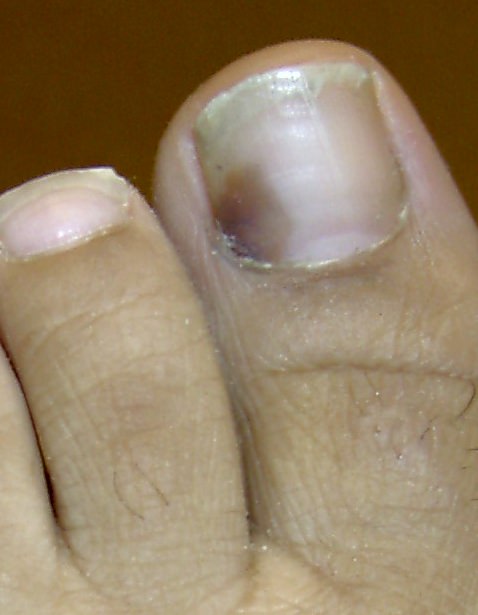 If you notice spots of red/brown/black color under the nail, it's most likely indicative of a hematoma, caused by mild trauma to the nail. The AOCD says that the best treatment is to elevate your feet and ice the injured toe.
