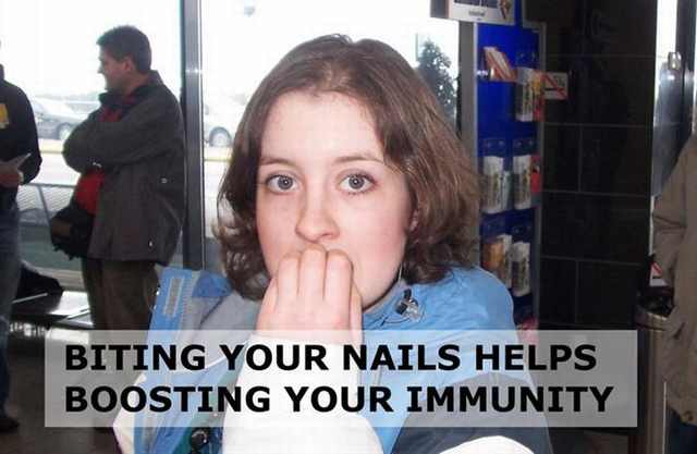 Nail Biting – although it’s considered a bad habit by society, humans have been biting their nails since the dawn of time. Nail biting prevents your nails from getting too long and breaking or cutting you and it exposes you to tiny amounts of bacteria from residue under your nails. Research shows that exposure to small amounts of bacteria on a regular basis actually strengthens the immune system.