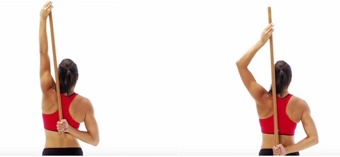 2. Standing up, hold the broomstick behind your back with both hands, keeping the injured hand above your head, and the other behind your back, near the tailbone. Slowly stretch your hand up until you feel the pull on the upper arm. Repeat this exercise 10 times in 3 consecutive sets.