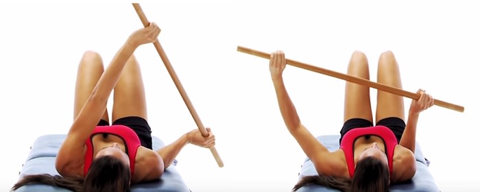 1. Lie down on a mat or towel, hold the broomstick with both hands. Extend the arm of the sore shoulder while keeping your other arm bent. Slowly move your hands from side to side 10 times. Rest and repeat until you have done 3 sets of 10.