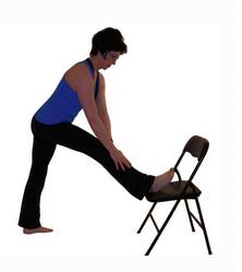 1. Place a low chair or table in front of you and gently raise your leg on to it, while keeping your chest and back straight.