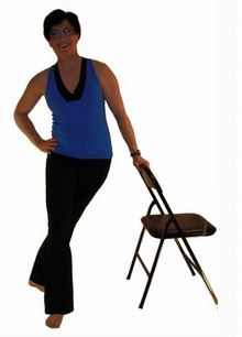2. Put your right hand on your right hip. Then push your left hip towards the chair while keeping your right leg straight.