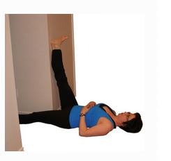 1. Lie on the floor near an open doorway. Raise one leg so it rests against an adjacent wall, while lying the other flat against the floor and through the open doorway.
