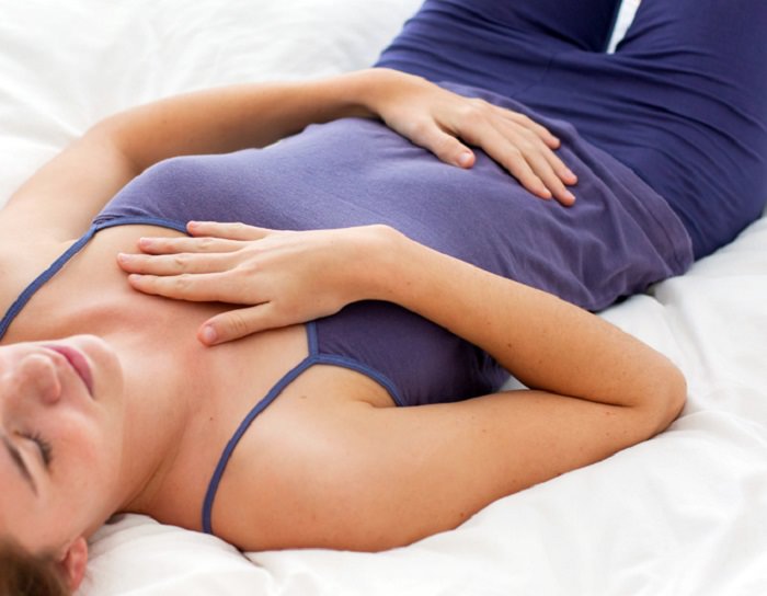 Sit down comfortably or lie down on the floor. Place your hands on your stomach to feel your breath expand. You may also place one hand on your belly and the other on your chest, doing so will allow you to feel your breath rise and fall.
