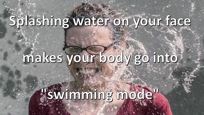 When splashing cold water on your face, your body enters a state called Mammalian diving reflex, which slows down your heart rate by 10-25% and optimzes your breathing.