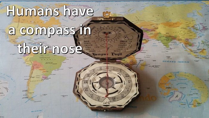 The human nose contains small amounts of magnetite, a magnetic substance that is also found in dolphins, bats, and homing pigeons - all of which use the Earth's magnetic fields to navigate.