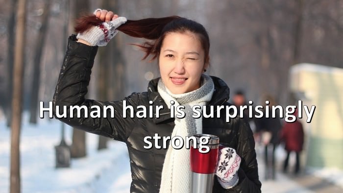 A single human hair can hold up to 100 grams of weight. A whole head of hair can hold as much as 2 grown elephants! (150,000 hairs = 15 tons)