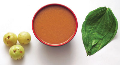 நெல்லிக்காயை விதை நீக்கி சாறு எடுக்கவும். கறிவேப்பிலை, கொத்தமல்லி இலை, வெற்றிலை மூன்றையும் பொடியாக நறுக்கிக்கொள்ளவும். வெறும் வாணலியில் காய்ந்த மிளகாயைக் கிள்ளிப் போட்டு, பொடியாக அரிந்த பூண்டு, ஒன்றிரண்டாகத் தட்டிய வால்மிளகு, சீரகம் ஆகியவற்றைப் போட்டு இளவறுப்பாக வறுக்கவும். பின்னர், பொடியாக நறுக்கிய கறிவேப்பிலை, வெற்றிலை, கொத்தமல்லி இலையை அதில் போட்டு, மஞ்சள் தூள் சேர்த்து வதக்கவும். நன்றாக வதங்கியதும் விழுதாக அரைத்துக்கொள்ளவும். வாணலியில் சிறிது எண்ணெய் ஊற்றி, அரைத்துவைத்துள்ள விழுதைப் போட்டு வதக்கவும். அதில் நெல்லிக்காய் சாறு, தேவையான அளவு நீர் சேர்த்துக் கொதிக்கவைக்கவும். அடுப்பை மிதமாக எரியவிடவும். கொதிக்கும் பக்குவம் வந்ததும், தேவையான அளவு உப்பு சேர்த்துக் கொதிக்கவிடாமல் கீழே இறக்கவும்.
