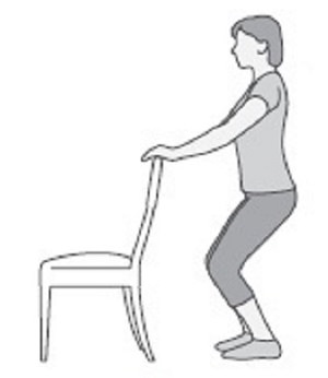 Hold onto a chair. Squat down until your kneecap covers your big toe. Return to standing. When you are first starting, complete 10 repetitions. Then, as you improve, try to squat a little further, just be sure not to bend your knees beyond a right angle.