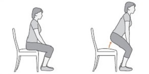 Sit on a chair. Without using your hands for support, stand up, then sit back down. Ensure that each movement is slow and controlled. Repeat this exercise for a total of 1 minute. Over time, as you feel more comfortable, try to increase the number of sit/stands in 1 minute and try the exercise from a lower chair, or the bottom steps of a staircase.