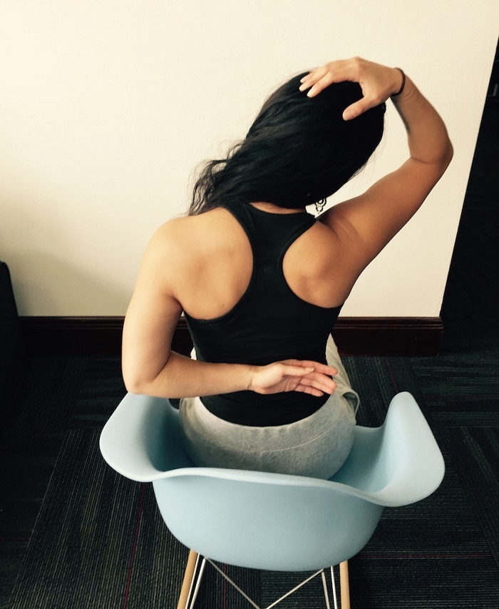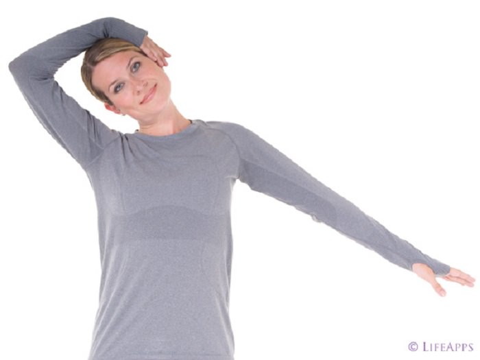 This side stretch will help lengthen and soothe the side of your neck and shoulders.