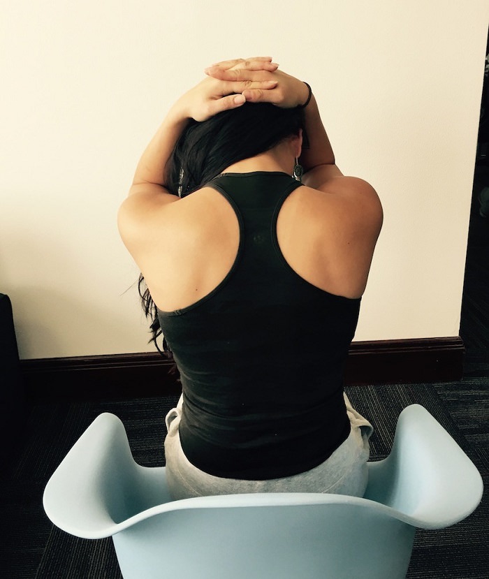 This stretch works on lengthening and soothing both sides of your neck. It also stretches the upper shoulders, chest and the mid-upper back.