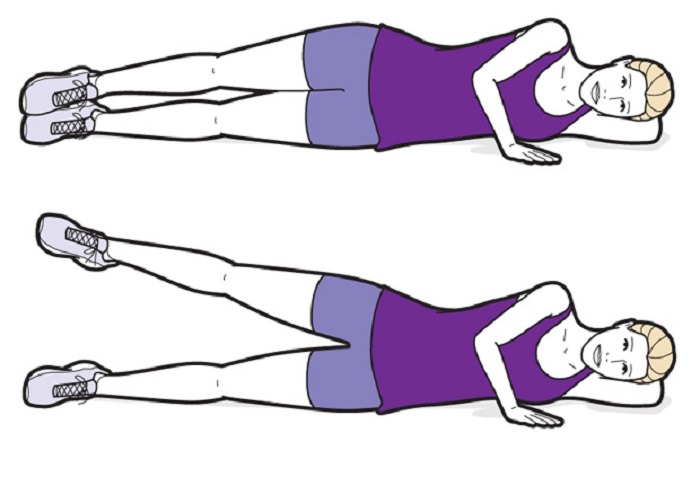 Lie on your side, keep your hips and feet stacked and rest your head on your arms. Raise the top leg a couple of inches, and pulse your leg up and down for 30 seconds. Once you are done, turn over to the other side and repeat.