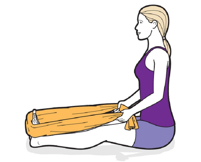 Sit on the floor. Keep your spine straight and your legs extended forward. Wrap a towel under the balls of your feet and hold one end in each hand. Keep your feet flexed and slowly pull the towel closer to your torso. Hold this position for 30 seconds.