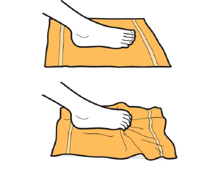 Sit on a chair and extend the right leg in front of you. Rest your foot flat on a hand towel. Scrunch the towel between your toes for 15 seconds then spread the towel out again. Repeat for another two times and when you're done, switch sides.