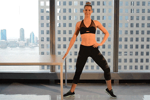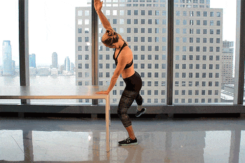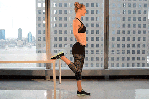 Stand with one hand resting on the table, keep your other hand on your hip. Bend the knee close to the table to a slight squat and raise the other knee up. Perform kicks in the air with the raised leg. Make sure not to straighten the other knee.