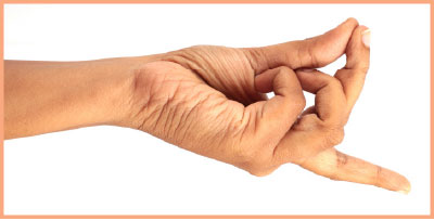 பெருவிரலில் உள்ள அடி ரேகை, நடு ரேகை மற்றும் நுனியைக் கவனிக்க வேண்டும். பின்னர் சுண்டுவிரலால் கட்டை விரலின் அடி ரேகையையும் மோதிர விரலால் கட்டை விரலின் இரண்டாவது ரேகையைத் தொட்டும், நடுவிரலின் நுனியால் கட்டை விரலின் நுனியைத் தொட வேண்டும். ஆள்காட்டி விரலை மட்டும் முழுமையாக மேல்நோக்கி நீட்டிவைக்க வேண்டும்.