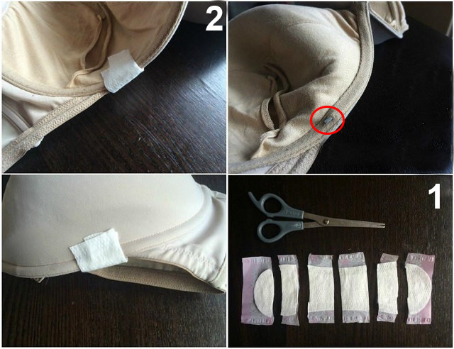 To temporarily fix the bra, so you don’t get poked by the wire, grab a hygienic pad and cut it into strips as seen in the picture below. Push the wire back into place, and then cover the hole with the padded strip. This way – even if the wire comes out again - it won’t poke or injure you.