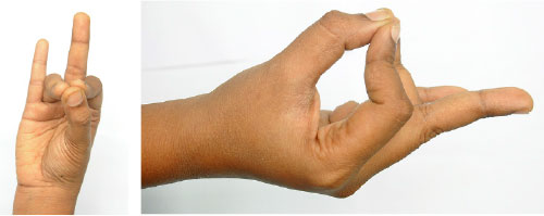 கட்டை விரல், ஆள்காட்டி விரல், மோதிர விரல்களின் நுனியைச் சேர்த்துவைக்க வேண்டும். நடுவிரலும் சுண்டுவிரலும் நீட்டி இருக்க வேண்டும்.