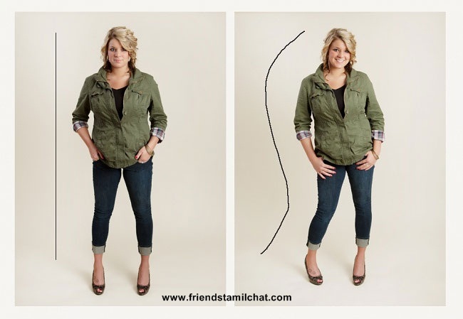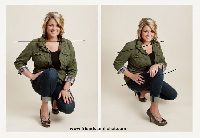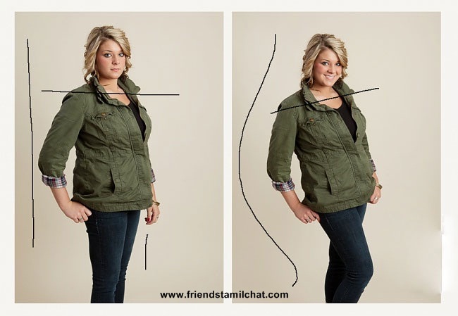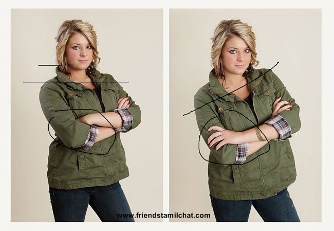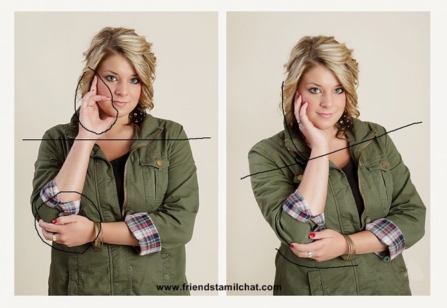 Directing your shoulders away from the camera will make you appear leaner. To make yourself appear more graceful, keep your hands in sight. In the second shot above, the model's hands are in view, placed on her hip area.