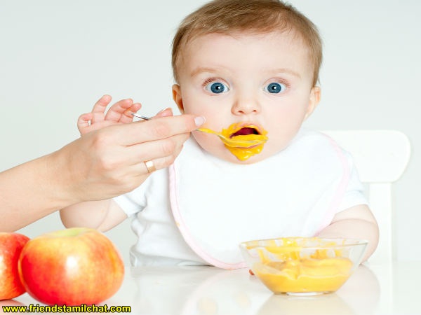 நான்கு மாதங்களுக்குப் பின்னர் குழந்தைகள் வேறு உணவை சாப்பிடுவதில் கவனத்தை செலுத்துவது போன்று தெரிந்தால், அப்போது ஒரு டேபிள் ஸ்பூன் வேக வைத்த இனிப்பு உருளைக்கிழங்கு, கேரட், ஆப்பிள், வாழைப்பழம், பீச் போன்றவற்றை நன்கு மசித்து கொடுக்க வேண்டும்.