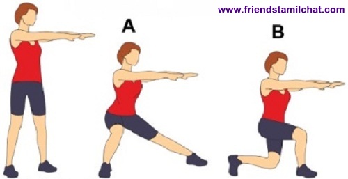3. Alternatively, you can do the classic lunges, as shown in illustration B. Stand with your right leg forward, and your left leg back. Slowly bend the knees until both legs are at a right angle. Then push back up to starting position. Keep your back straight and don't let your knees extend over the toes. Practice one set for each leg at 10 to 15 repetitions.