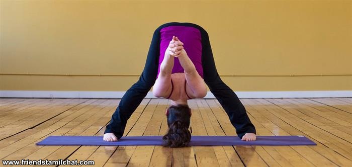 From the wide squat pose (#3), take a deep breath and move your hands behind your back. Straighten your legs, exhale slowly and bend forward.
