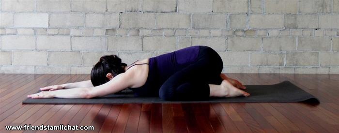 Sit on your knees with your buttocks between your ankles. Support yourself with your hands. Exhale as you lower your stomach down between your knees until you’re at the pose depicted in the photo above.
