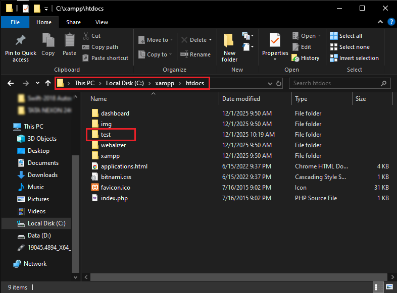 Open the XAMPP directory through the ‘Explorer’ button in the Control Panel and choose the folder htdocs (C:\xampp\htdocs for standard installations). This directory will store file data collected for web pages that you test on your XAMPP server. The htdocs folder should already contain data to help configuration of the web server. But you should store your own projects in a new folder (like ‘Test Folder’ for example).