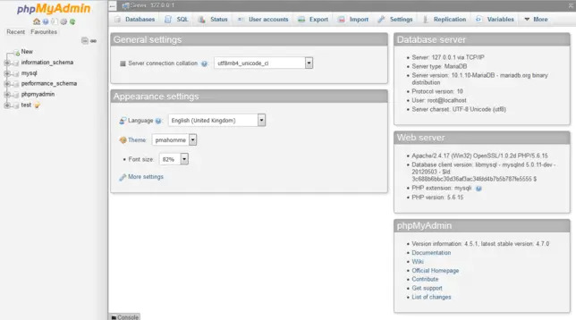 You can use the Admin button of your database module to open phpMyAdmin. Here, you can manage the databases of your web projects that you’re testing on your XAMPP. Alternatively, you can reach the administration section of your MySQL database via localhost/phpmyadmin/.