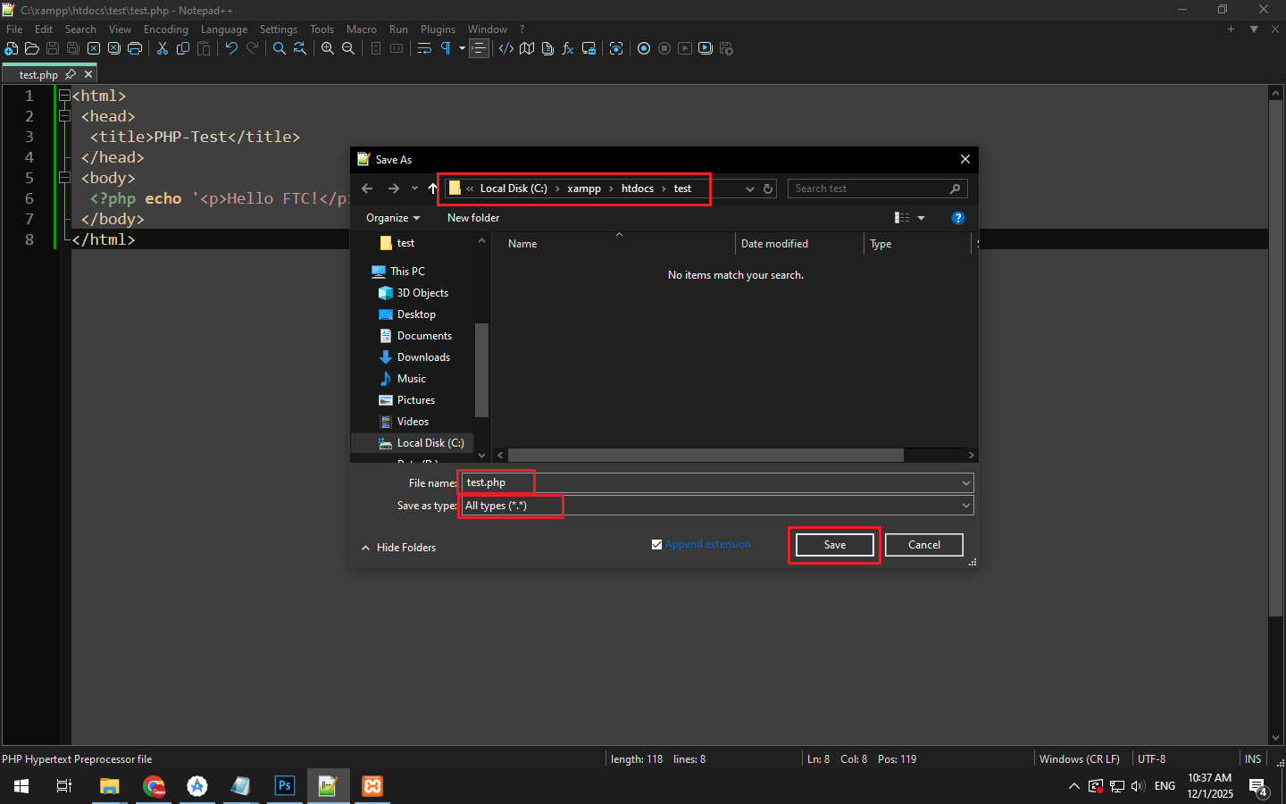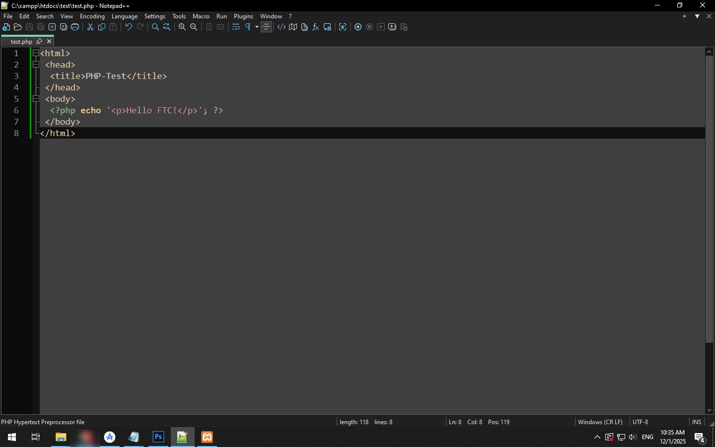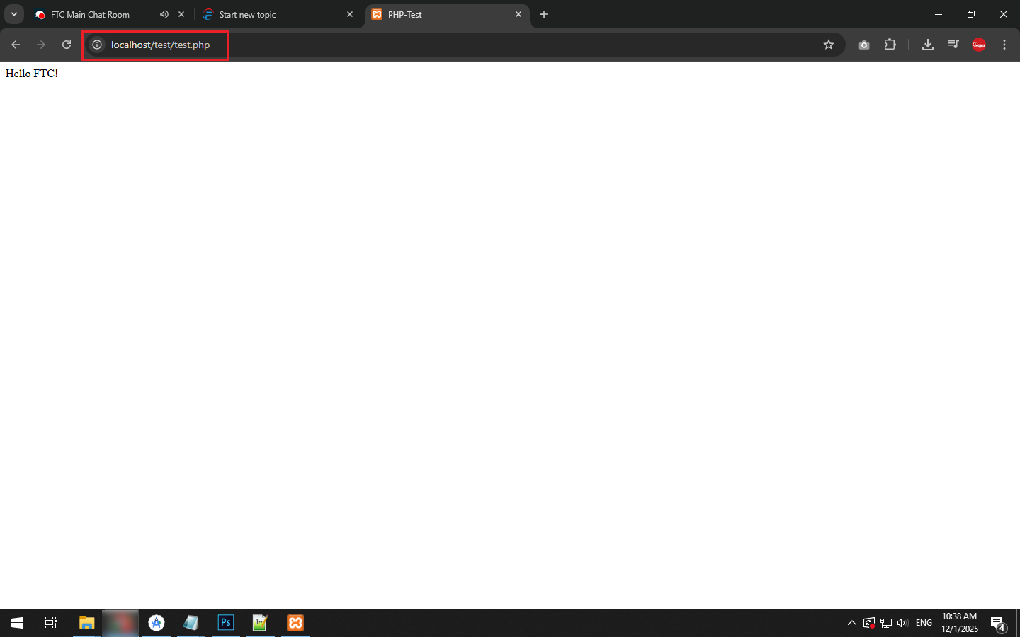 The last step now is to open your web browser and load your PHP page via localhost/test/test.php. If your browser window displays the words ‘Hello FTC!’, then you’ve successfully installed and configured your XAMPP.