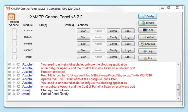A common source of error connected with Apache is blocked ports. If you’re using the standard setup, then XAMPP will assign the web server to main port 80 and the SSL port 443. The latter of these particularly is often blocked by other programs. In the example above, it’s likely that the Tomcat port is being blocked, meaning the web server can’t be started. There are three ways to solve this issue: